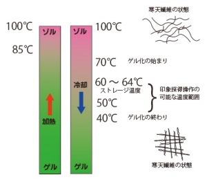 ・逆に図1の右側の様に冷却すると約70℃で流動性を持たないゲルへの変化が始まります。